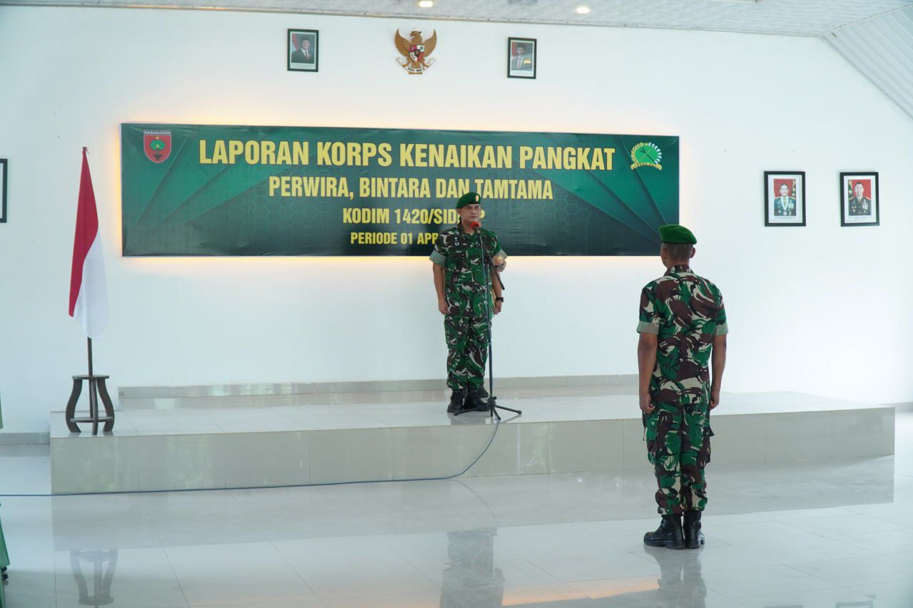 Aula Makodim 1420/Sidrap, Rabu pagi (01/04/2026), dipenuhi rasa bangga dan haru. Sebanyak 11 personel Kodim 1420/Sidrap resmi menerima kenaikan pangkat dalam kegiatan Korps Raport Perwira, Bintara dan Tamtama periode 1 April 2026.