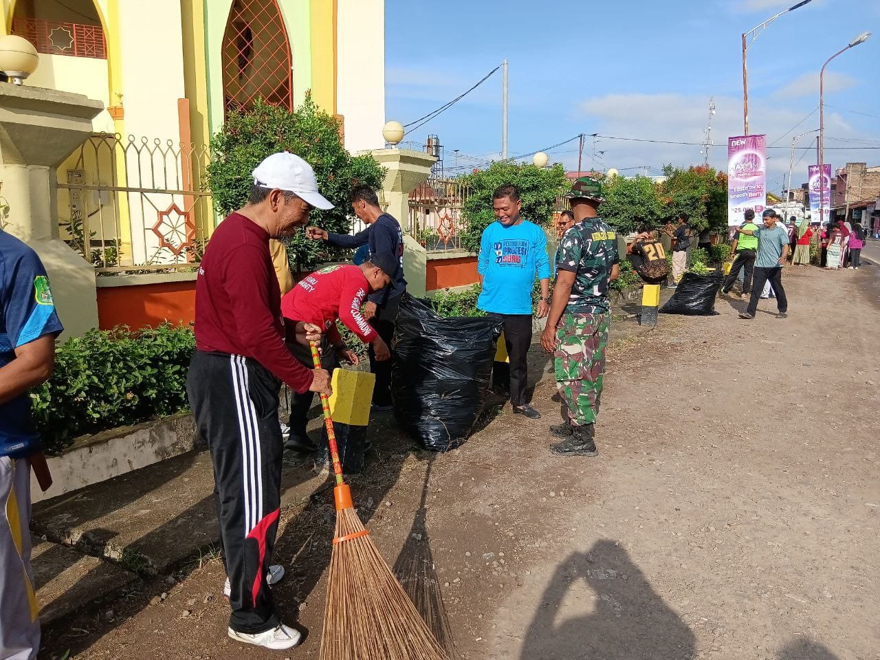 Babinsa Koramil 1420-05/Dua Pitue bersama warga membersihkan sampah yang ada di sekitaran halaman Masjid Besar Raudhatul Jannah dan Lapangan Olah Raga Andi Takko.
