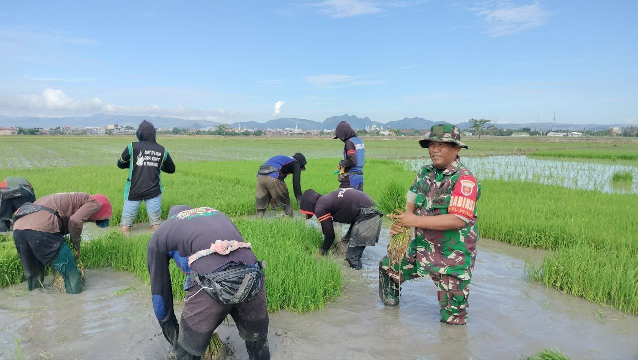 Sidrap – Babinsa Kelurahan Wala, Koramil 1420-03/Maritengngae, Serka Irwan, turut serta mendampingi petani dalam kegiatan tanam pindah dan luas tambah tanam (LTT) di Kelompok Tani (Poktan) Wala Baru, Kecamatan Maritengngae, Kabupaten Sidrap, pada Selasa (3/6/2025).