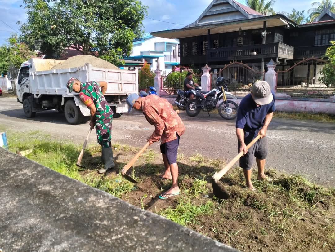 Terlihat warga bersama Babinsa tampak kompak sambil bercanda, membersihkan saluran air dengan menggunakan alat seperti cangkul dan skop serta sapu.
