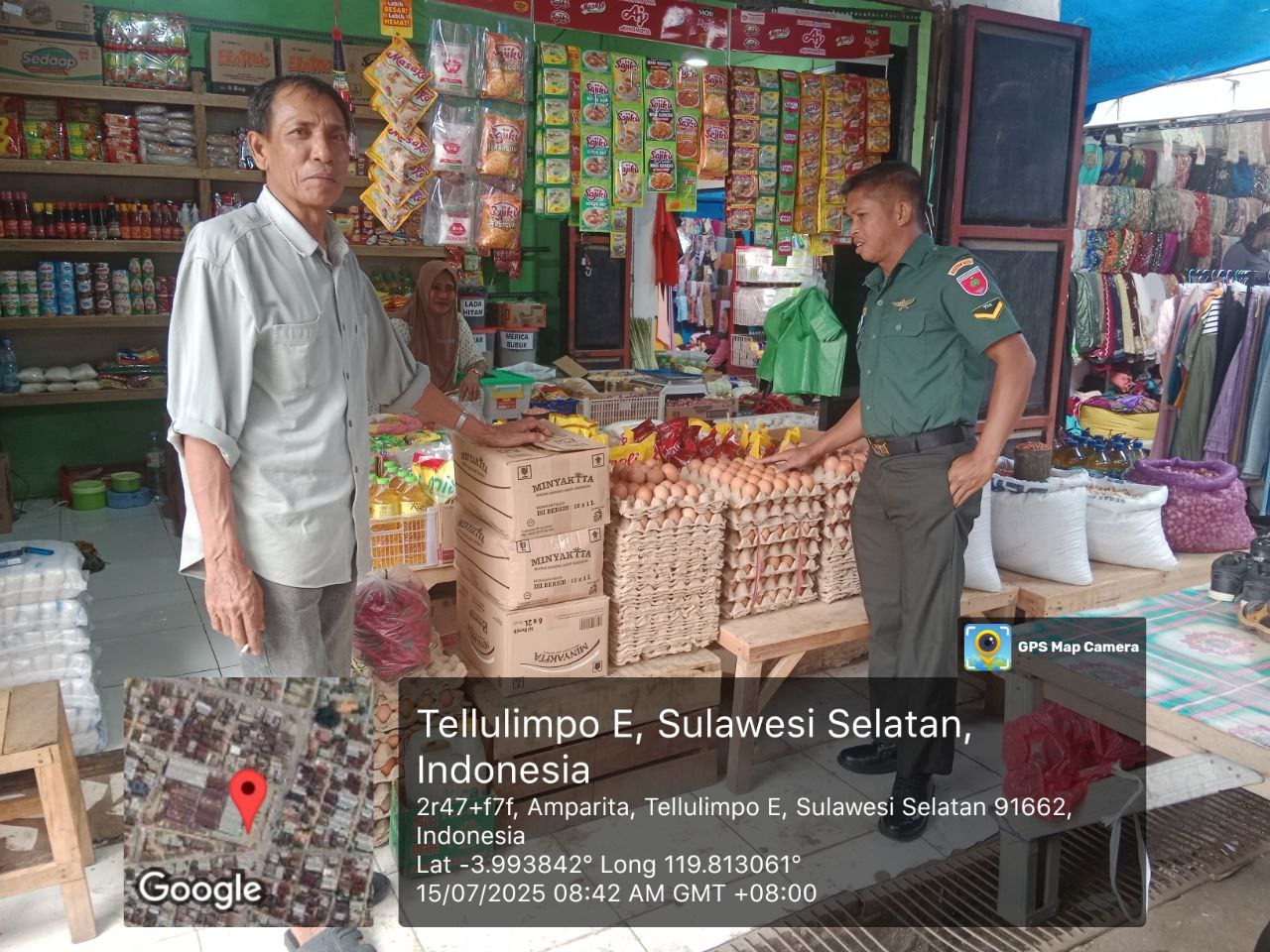 Sidrap – Babinsa Koramil 1420-02/Tellu Limpoe, Serda Lannang, melaksanakan kegiatan pemantauan terhadap ketersediaan dan harga bahan kebutuhan pokok di Pasar Sentral Amparita, Kelurahan Toddang Pulu, Kecamatan Tellu Limpoe, Kabupaten Sidenreng Rappang (Sidrap), Selasa (15/07/25)