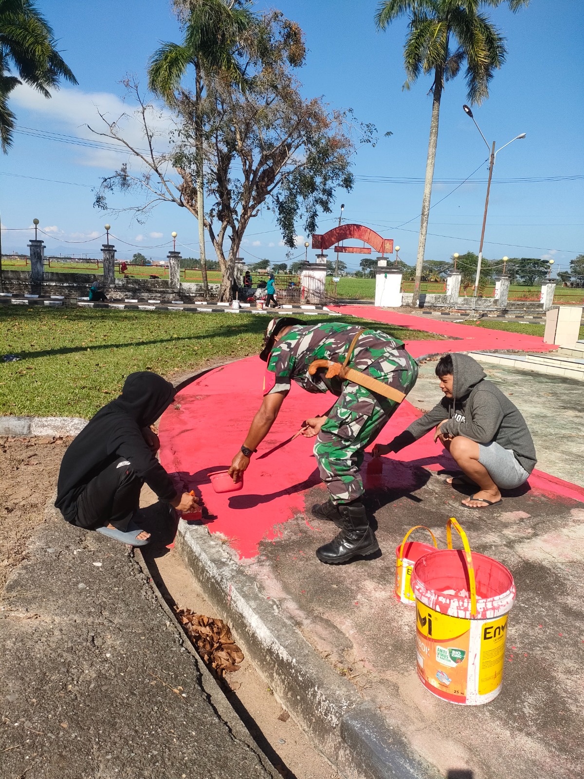 Sidrap – Babinsa Desa Mario Koramil 06/Panca Rijang, Sertu Bohaseng, bersama Staf Desa Mario dan mahasiswa Kuliah Kerja Nyata (KKN) melaksanakan pengecatan Taman Makam Pahlawan (TMP) Mario, Desa Mario, Kecamatan Kulo, Kabupaten Sidrap, Kamis (14/08/25)