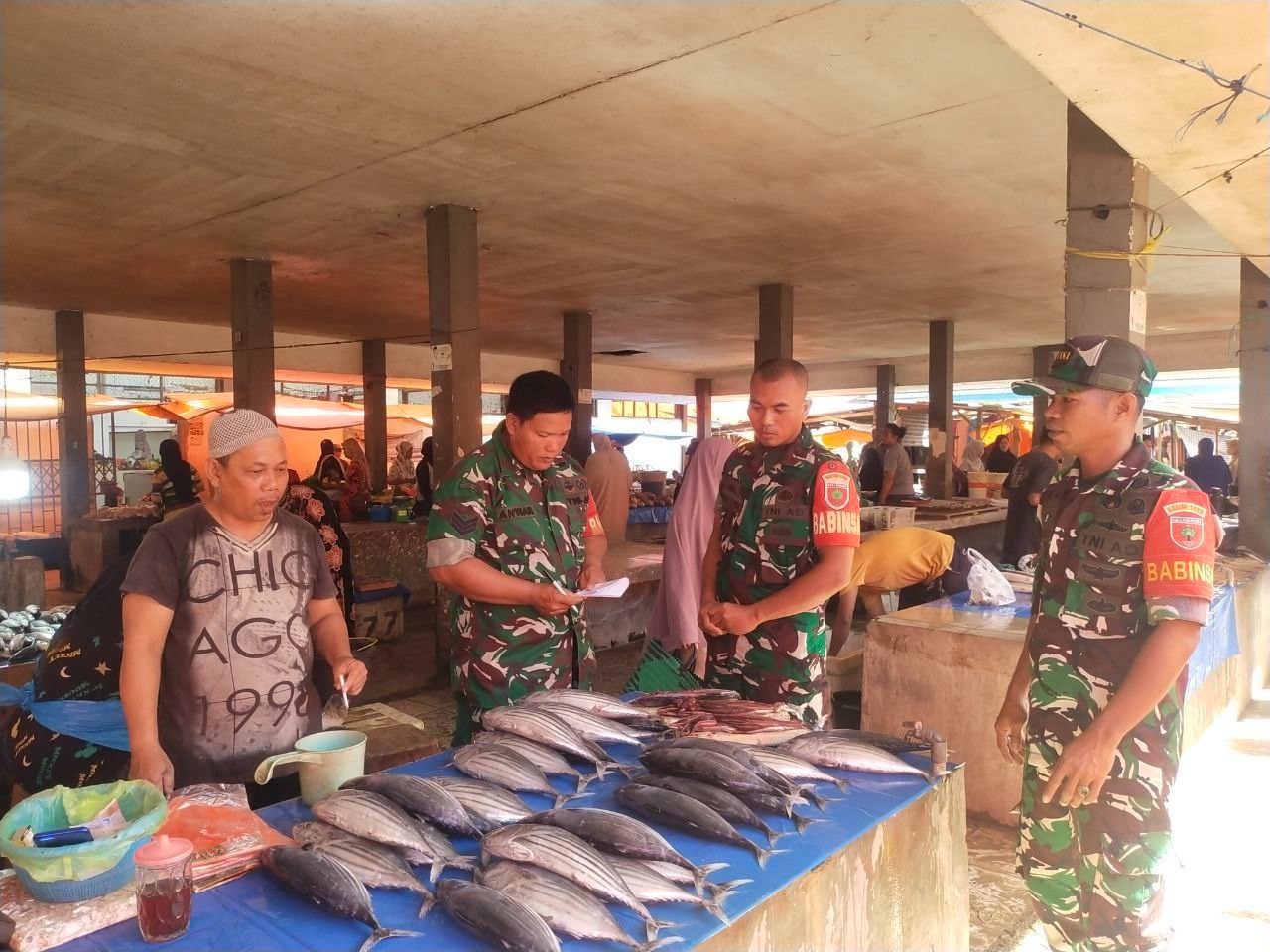 Babinsa Koramil 1420-07/Baranti, Serka Anwar bersama dengan Sertu Zainuddin dan Sertu Firdaus melaksanakan monitoring harga kebutuhan pokok di Pasar Sentral Baranti Desa Passeno Kecamatan Baranti Kabupaten Sidrap, kegiatan ini bertujuan untuk memastikan ketersediaan dan stabilitas harga sembako di pasaran. Kamis (25/09/2025).