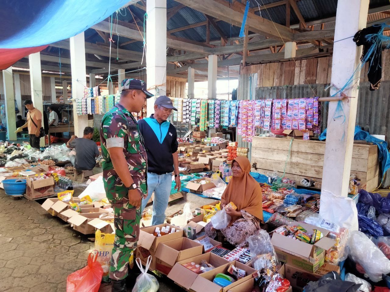 Di antara hiruk pikuk aktivitas jual beli, Kopda Irwan dengan teliti mencatat harga dan ketersediaan berbagai komoditas.