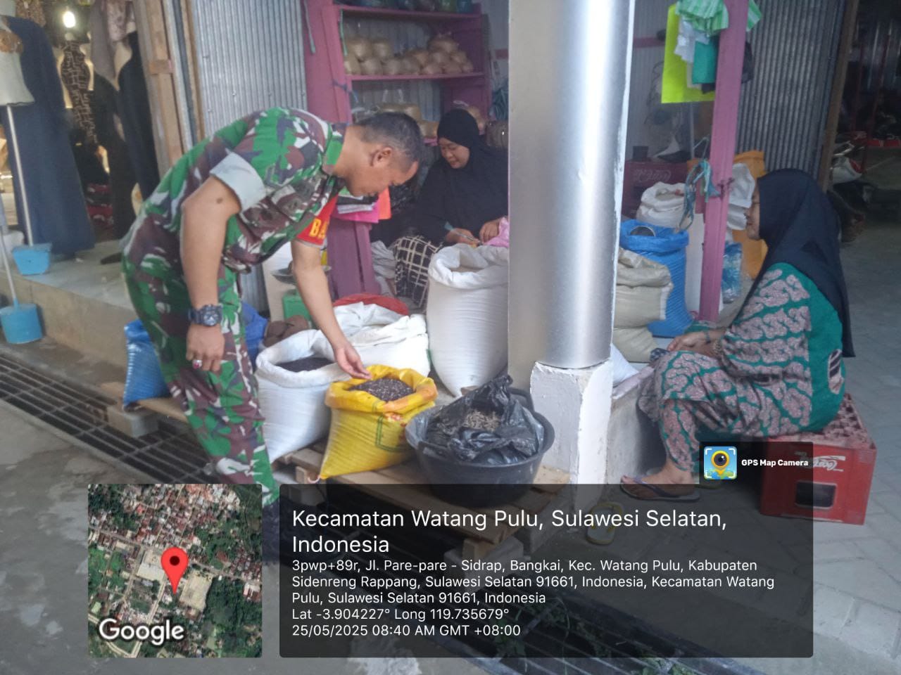 Sidrap, – Guna memastikan kebutuhan pokok masyarakat tetap terpenuhi dengan harga yang wajar, Babinsa Koramil 1420-04/Watang Pulu, Serda Irfan Idrus, turun langsung memantau kondisi Pasar Rakyat Lawawoi, Desa Lawawoi, Kecamatan Watang Pulu, pada Minggu (25/5/2025).