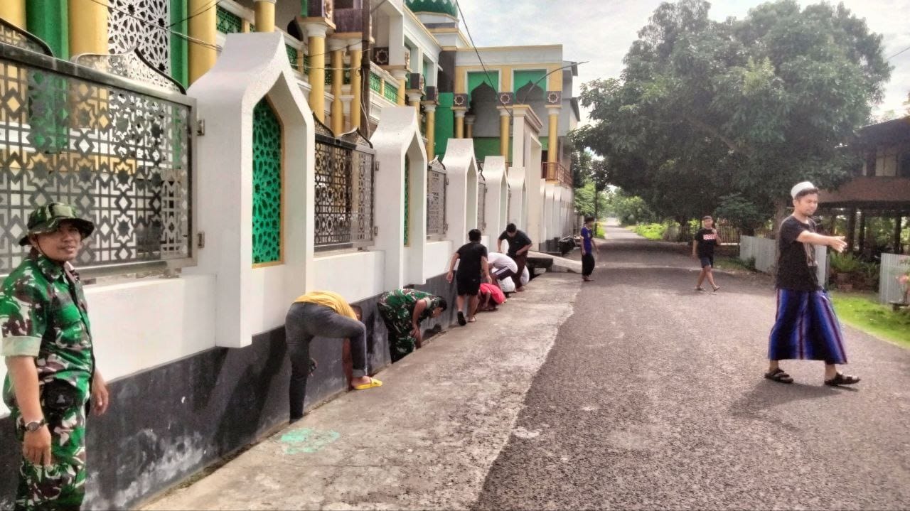 Babinsa Kelurahan Ulu Ale, Pelda Andi Akbar, turun langsung ke lapangan bersama para santri Pondok Pesantren Unwarul Qur’an untuk melaksanakan aksi bersih-bersih saluran air di sekitar Masjid Babul Jamaah.