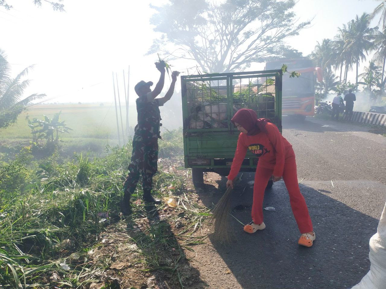 Babinsa Desa Passeno Koramil 1420-07/Baranti Kodim 1420/Sidrap Sertu Firdaus bersama Staf Desa, Tenaga Kesehatan dan warga melaksanakan kegiatan gotong-royong membersihkan fasilitas umum kanan kiri jalan poros perbatasan Sidrap – Pinrang Desa Passeno Kecamatan Baranti Kabupaten Sidrap, Jumat (26/09/2025).