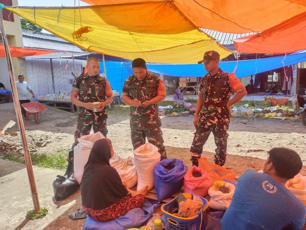 Babinsa berinteraksi Langsung dengan para penjual, menanyakan berbagai harga kebutuhan pokok baik itu beras, gula, minyak goreng, telur, daging, susu, bawang, cabe serta kebutuhan lainnya.