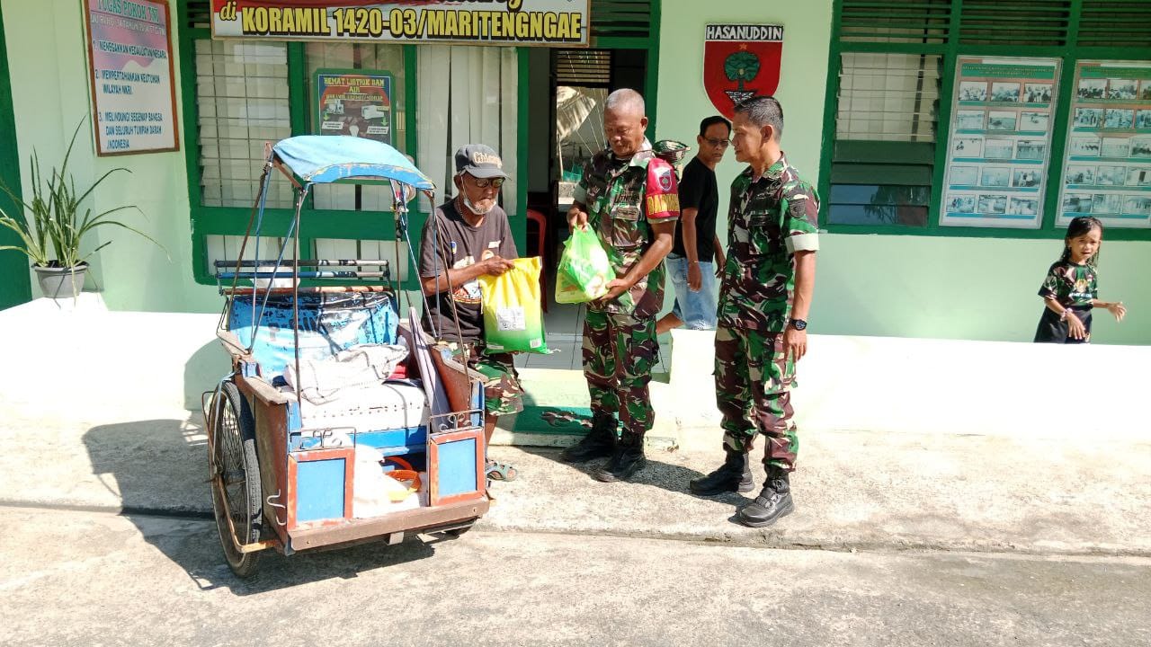 Sidrap – Sebagai wujud kepedulian terhadap sesama, personel Koramil 1420-03/Maritengngae kembali melaksanakan kegiatan sosial bertajuk Jumat Berkah dengan membagikan paket sembako kepada warga kurang mampu di wilayah Kecamatan Maritengngae, Kabupaten Sidrap, Jumat (4/7/2025).