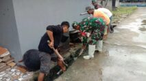 Babinsa Koramil 1420-02/Tellu Limpoe bersama warga gotong royong bersihkan lingkungan.