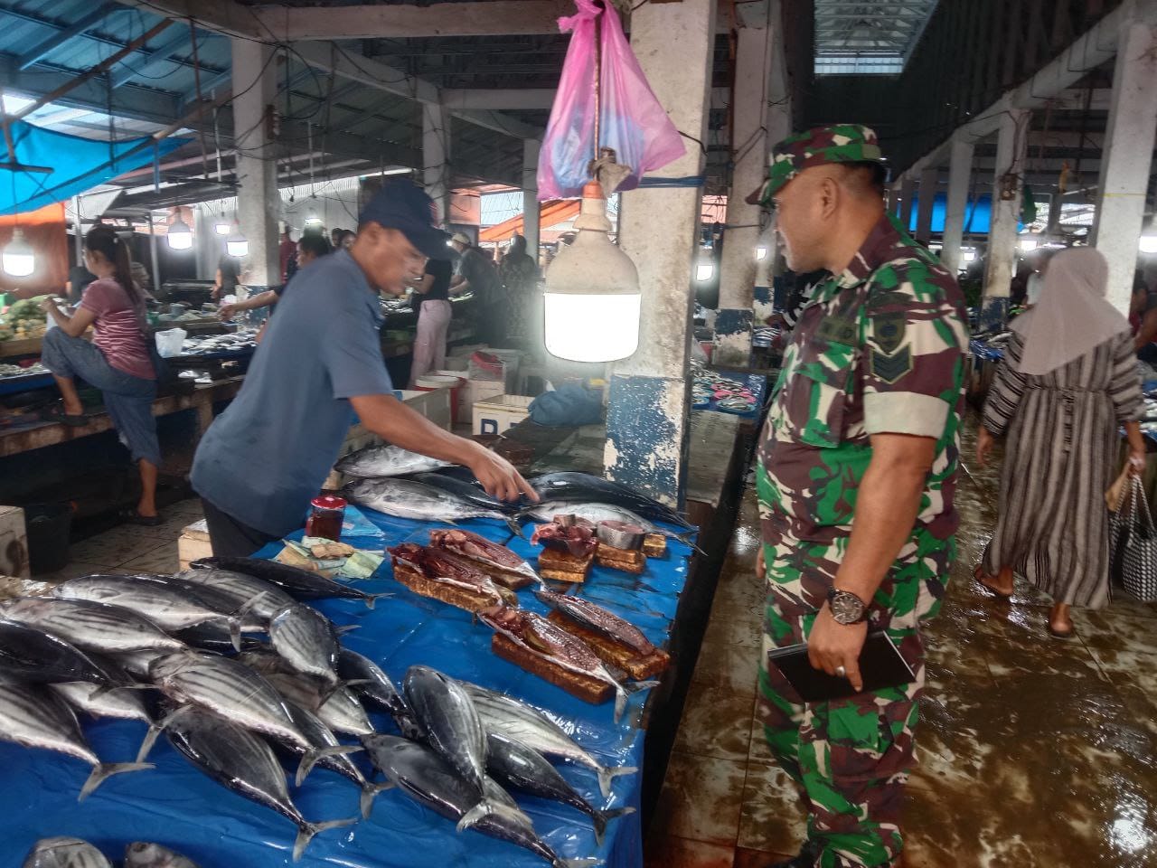 Dengan penuh kepedulian, Serka Ahmadi menyusuri lorong-lorong pasar, menyapa para pedagang dan warga sambil mencatat perkembangan harga sejumlah bahan pokok seperti beras, minyak goreng, gula pasir, telur, hingga sayur mayur.