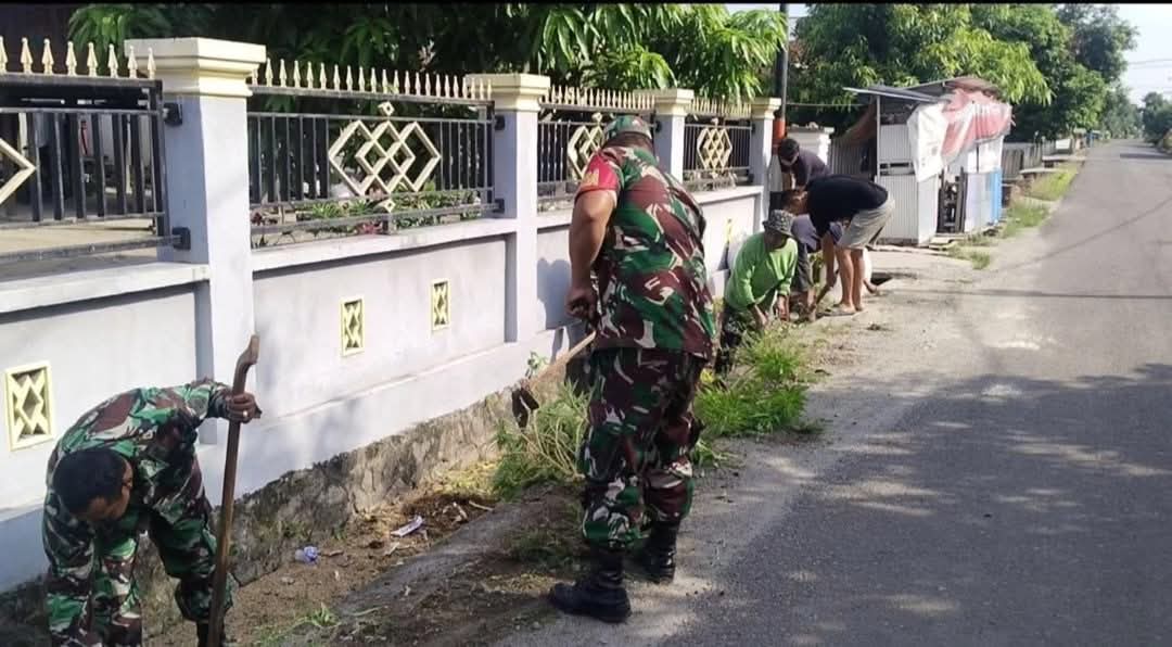 Terlihat warga bersama Babinsa tampak semangat dan kompak bahu-membahu membersihkan saluran air dengan menggunakan alat Korvey seperti cangkul dan skop serta sapu.