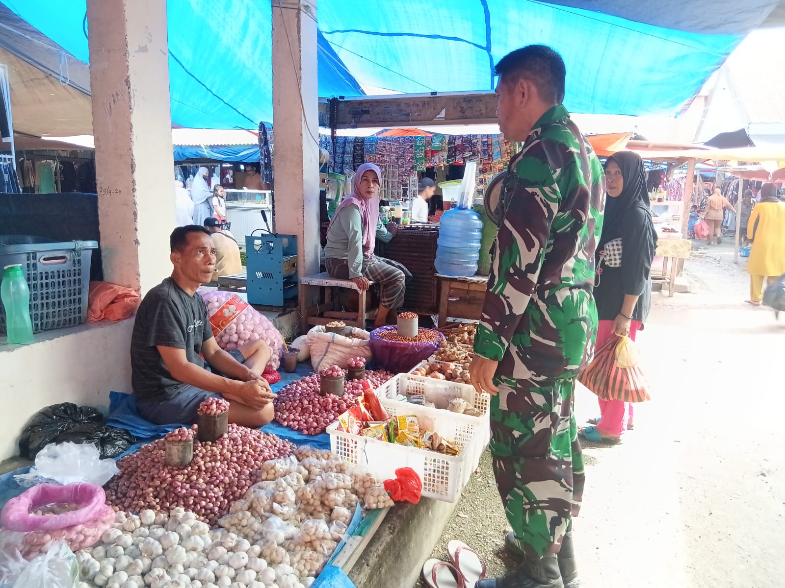 Sidrap – Babinsa Kel. Lancirang Koramil 05/Dua Pitue Peltu Muh. Ridwan melaksanakan kegiatan pemantauan ketersediaan dan harga bahan pokok bertempat di Pasar Tradisional Lancirang Kel. Lancirang Kec. Pitu Riawa Kab. Sidrap, Sabtu (12/07/25)