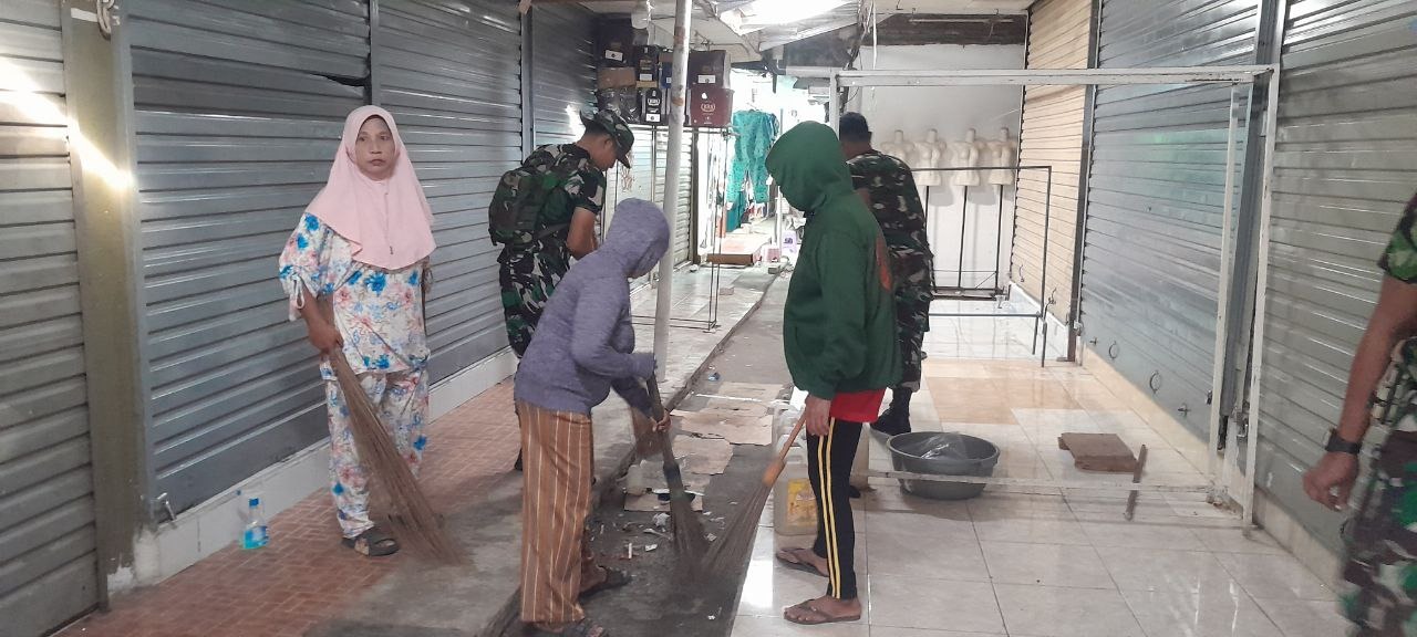 SIDRAP – Anggota Koramil 1420-03/Maritengngae Kodim 1420/Sidrap bersama warga setempat menunjukkan semangat gotong royong yang tinggi dengan melaksanakan kegiatan Karya Bakti pembersihan di Pasar Sentral Pangkajene, Kecamatan Maritengngae, Kabupaten Sidrap, pada hari Minggu, 19 Oktober 2025.