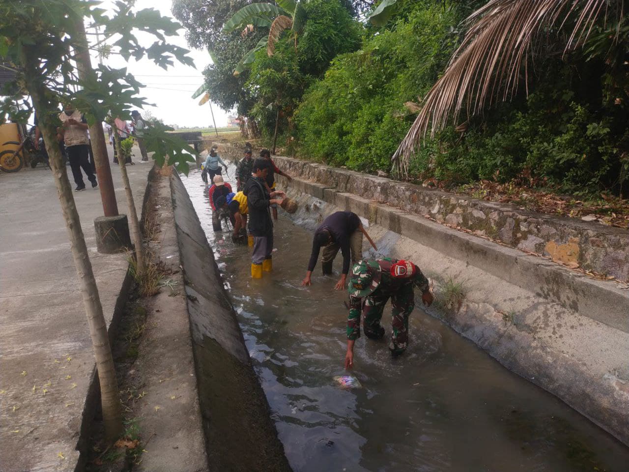 Sertu Alimuddin (Babinsa Kel.Rappang) dan Serda Untung Musriadi(Babinsa desa Bulo) mereka bersama petani turun langsung menyusuri Saluran irigasi memastikan air mengalir lancar terhindar dari sampah dan material yang menghalangi.