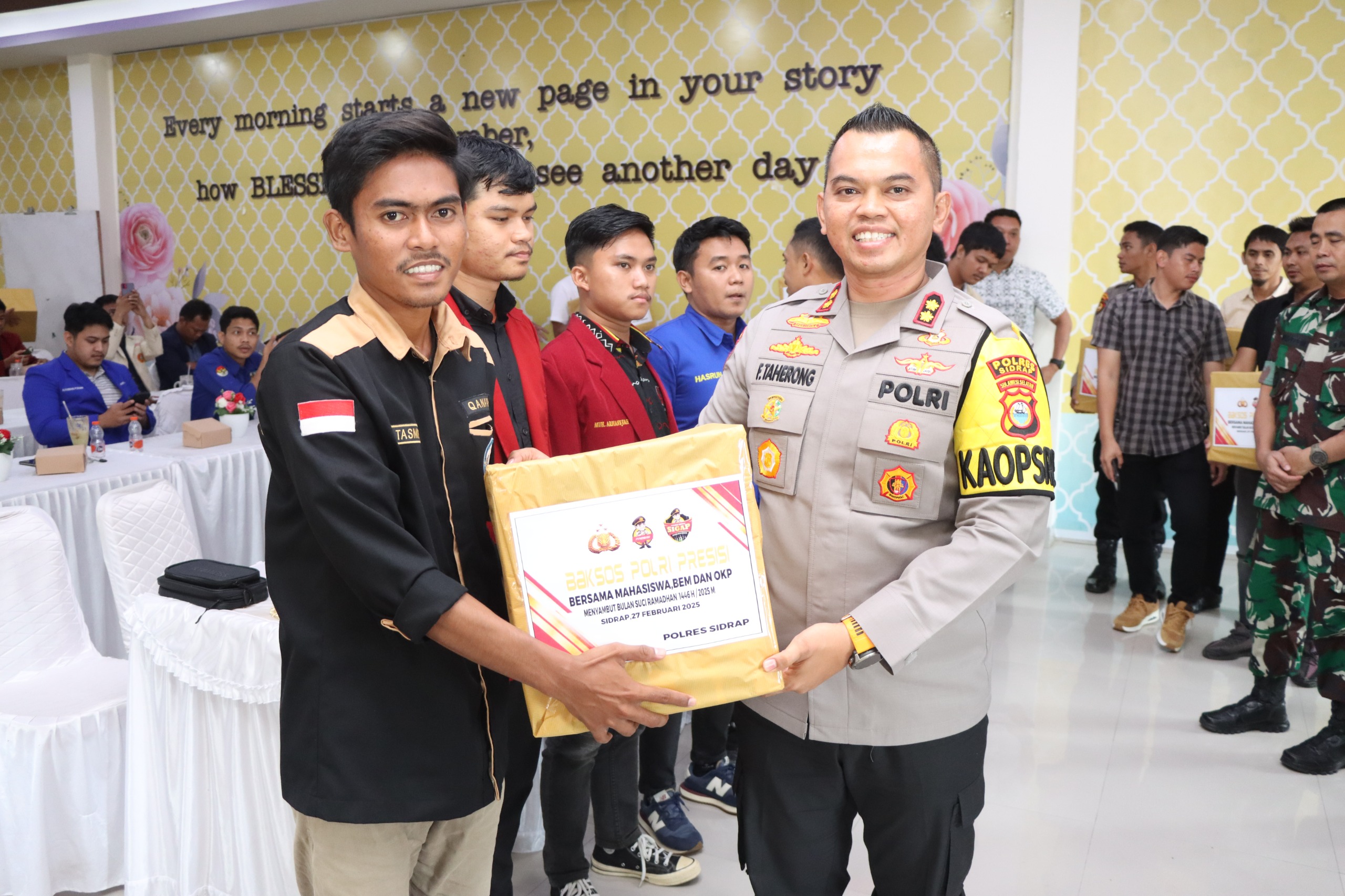 SIDRAP, – Menyambut bulan suci Ramadhan, Kapolres Sidrap, AKBP Fantry Taherong bersama Forum Koordinasi Pimpinan Daerah (Forkopimda) Kabupaten Sidrap menggelar Bakti Sosial (Baksos) untuk mahasiswa Aliansi Badan Eksekutif Mahasiswa (BEM) dan Organisasi Kepemudaan (OKP) se-Kabupaten Sidrap.