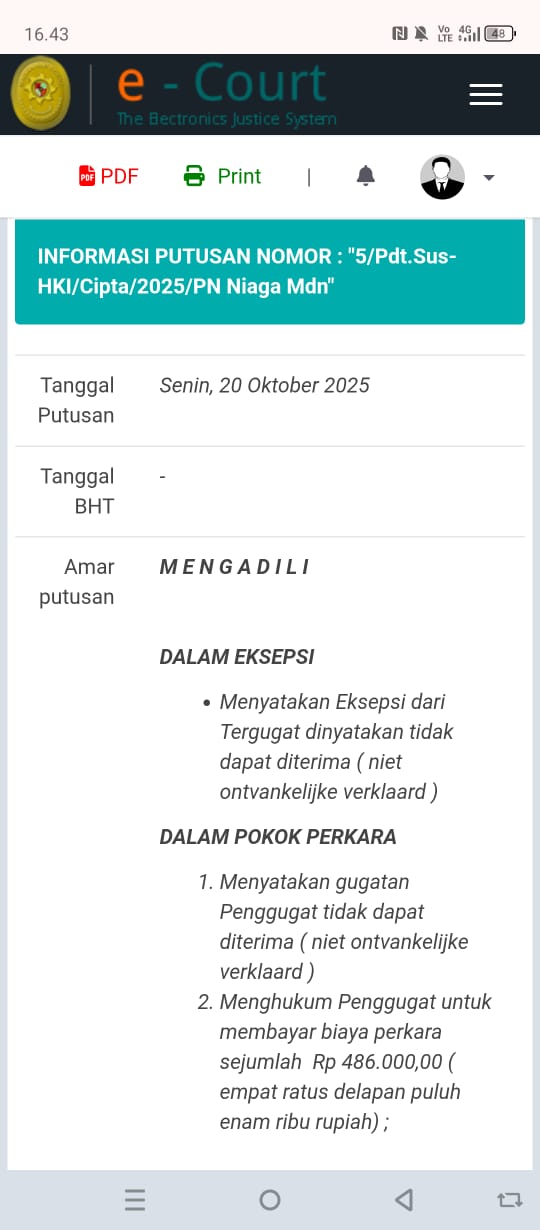 Berdasarkan amar putusan atas perkara No “5/Pdt.Sus-HKI/Cipta/2025/PLN Niaga Mdn” yang dirilis melalui sistem e-court pada Senin malam, 20 Oktober 2025 dijelaskan di poin mengadili bahwa “Menyatakan Eksekpsi dari tergugat dinyatakan tidak dapat diterima (niet ontvankelijke verklaard).