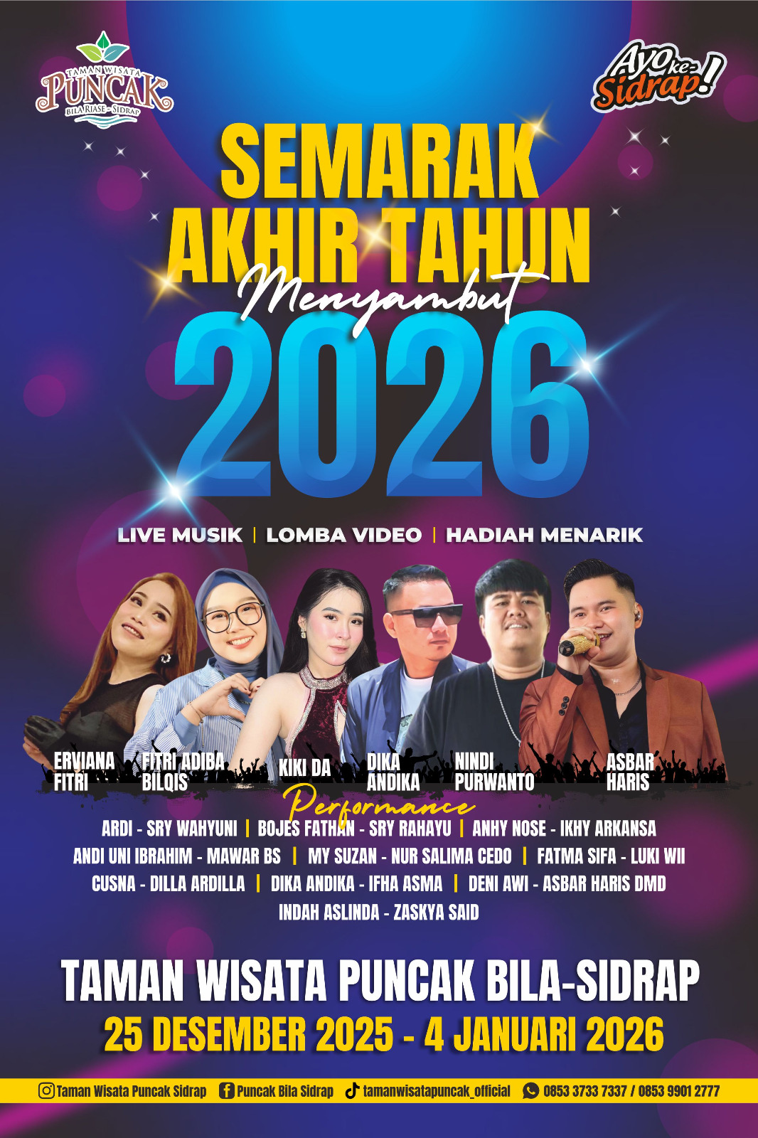 Mengusung tajuk “Semarak Akhir Tahun Menyambut 2026”, destinasi wisata alam ini menghadirkan rangkaian hiburan musik, lomba kreatif, serta pertunjukan seni yang akan berlangsung selama sepuluh hari penuh, mulai 25 Desember 2025 hingga 4 Januari 2026.