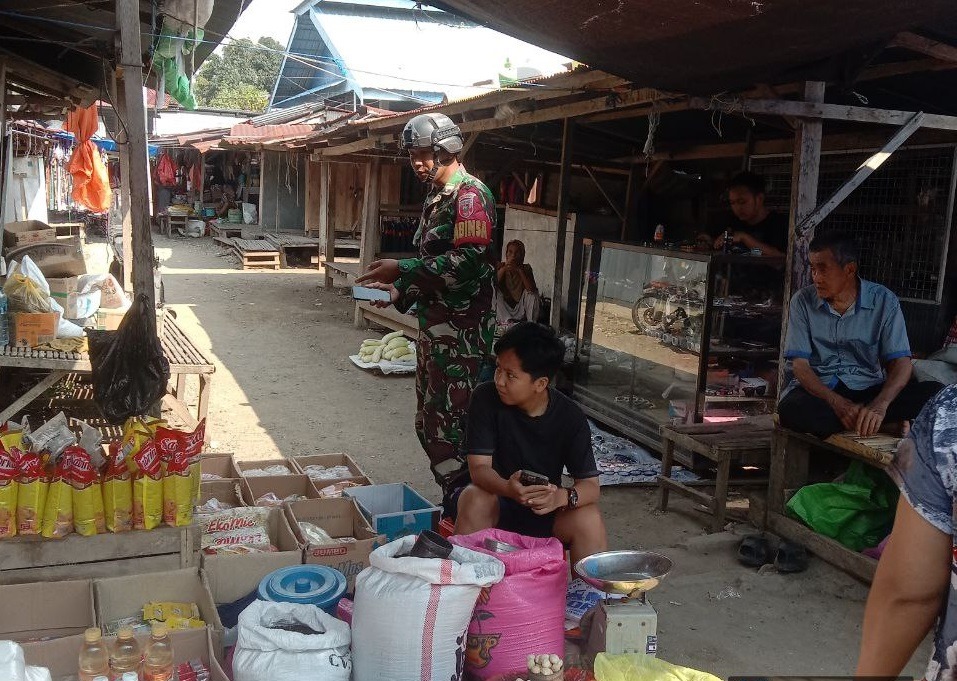 Sidrap – Babinsa Koramil 1420-01/Panca Lautang Kodim 1420/Sidrap Sertu Isman melaksanakan kegiatan monitoring dan pengecekan rutin ketersediaan serta harga kebutuhan bahan pokok (sembako) di Pasar Sentral Bilokka Desa Corawali Kecamatan Panca Lautang Kabupaten Sidrap, Rabu, 8 Oktober 2025.