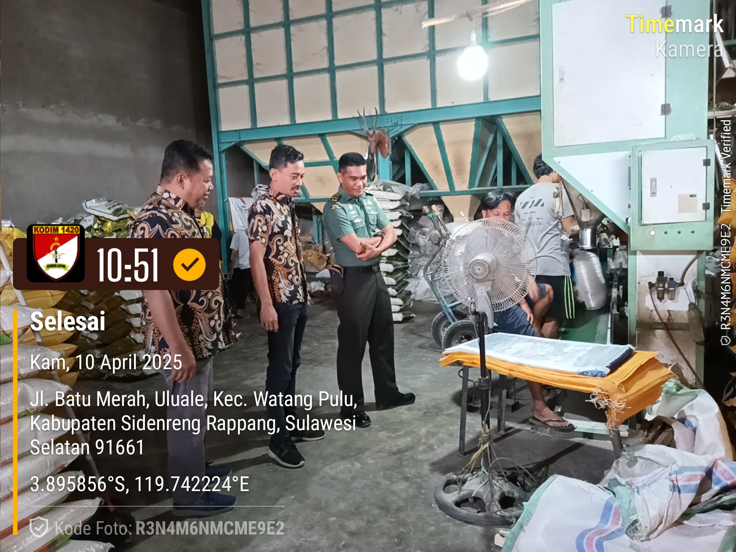 SIDRAP-Dalam upaya memastikan kelancaran distribusi dan memantau ketersediaan beras serta memastikan pasokan pangan tetap stabil dan aman bagi masyarakat. Ws. Pasiter Kodim 1420/Sidrap Letda Inf Murjalil bersama dengan Tim Perum Bulog Kabupaten Sidrap mengunjungi Penggilingan Padi yang menjadi Mitra Perum Bulog yang berlokasi di Kabupaten Sidrap, Kamis (10/04/2025).